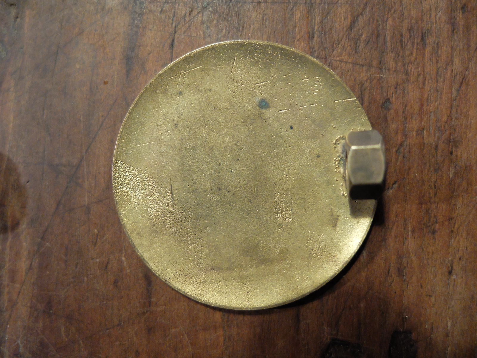 Un écrou soudé au dos laisse penser qu'elle a été adaptée pour une pose sur pare choc ou calandre automobile.