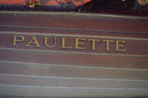 Paulette est un ancien bateau de la Société Nautique de la Marne dont il porte le fanion sur sa pointe avant. Ce club historique situé sur l'île Fanac à Joinville-le-Pont est aujourd'hui l'AMJ, Aviron Marne Joinville. L'accastillage et les avirons sont manquants.